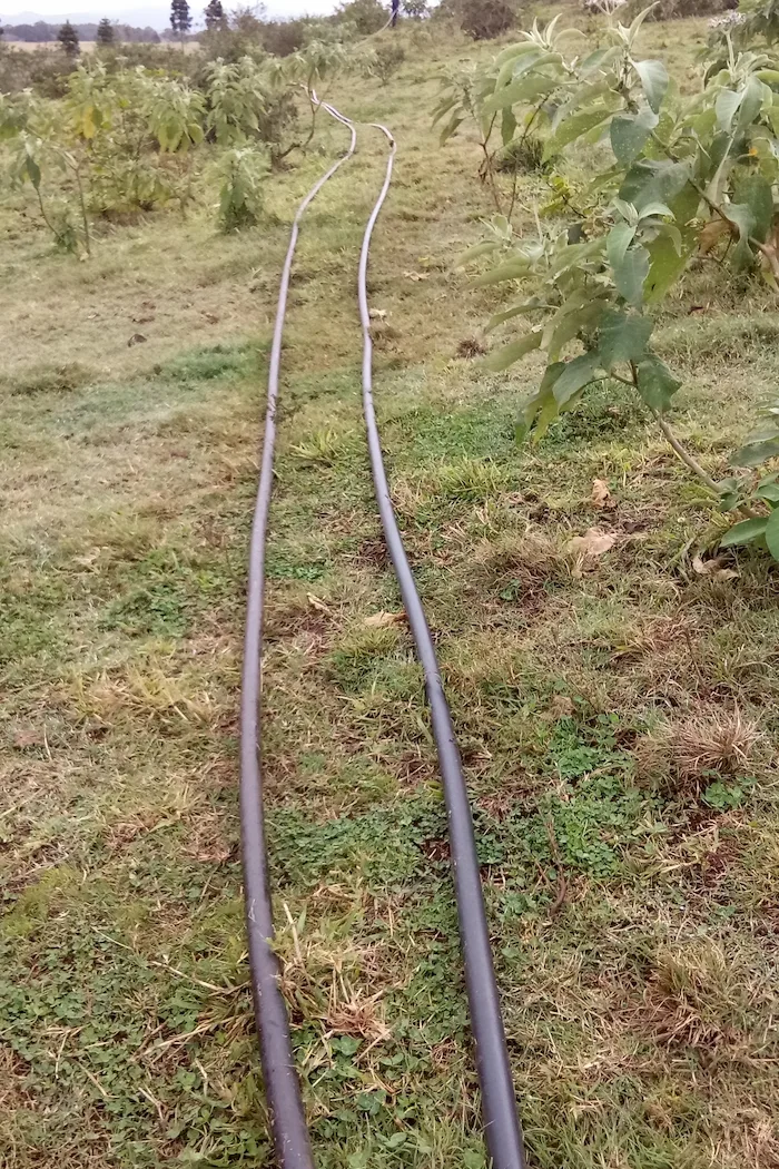 For this to happen, the two water pods had to be transported and placed in the top center of the planted area and connected with a pump on the owner’s property that retrieved water from their well (approximately 1,000 meters away). Water could then be pumped to the water pods and gravity could be used to drain water from them to the seedlings via small hoses.