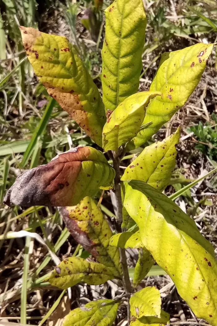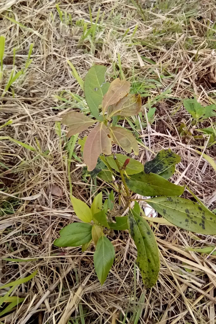 As the tropical winter emerged (June to August), night time temperatures can drop considerably due to the higher elevation of the Atherton Tablelands, raising concerns of frost affecting the seedlings. This was a worry since the seedlings were fully exposed to the elements. But, although the Atherton Tablelands experienced two nights of frost in August 2024, we were lucky as no seedling showed signs of frost impact; some only showed some black spots at the lower leaves which were attributed to lasting wet conditions during the winter (Figure 7). The fact that our seedlings were not affected by these frost events was mainly due to the slight elevation of our planted plot on the cinder cone, as frost is mainly located in lower areas. To protect the seedlings from further frost impacts, mulch was added by utilizing the cut grass that accumulated from weed control, which was packed around each seedling.