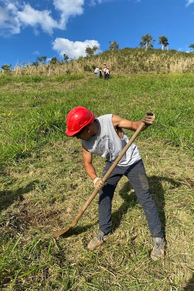 The first challenge arose due to the landowner’s request to not use herbicides as means of weed removal. This required countless weeks of cutting grass manually on this first 60x32m planting plot as grass had grown immensely after the plot was first isolated from the surrounding cattle. Additional donations allowed for the purchase of hedge cutters and other materials to make the work possible. Although a more laborious process, not using herbicides provides added soil benefits and allows students to compare seedling growth on this site with that of seedlings on a similar Mabi site that was treated with RoundUp (glyphosate).