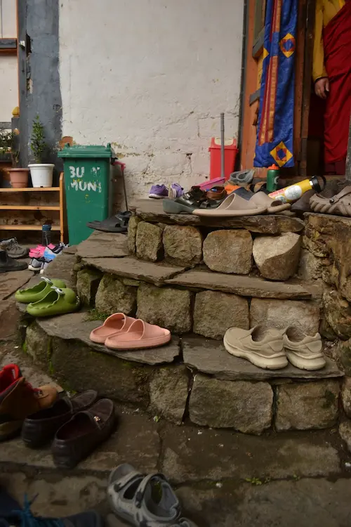 You’d feel the worn notches of the prayer wheel handles under your fingertips as you begin to build momentum. Together, we try to spin them a total of three times, an auspicious number in Buddhism, but the sheer size of our group keeps the wheels spinning far longer. The ringing bells and rattling wood follow you as you walk away, just as the yellow frill on top of the wheel leaves your peripheral.