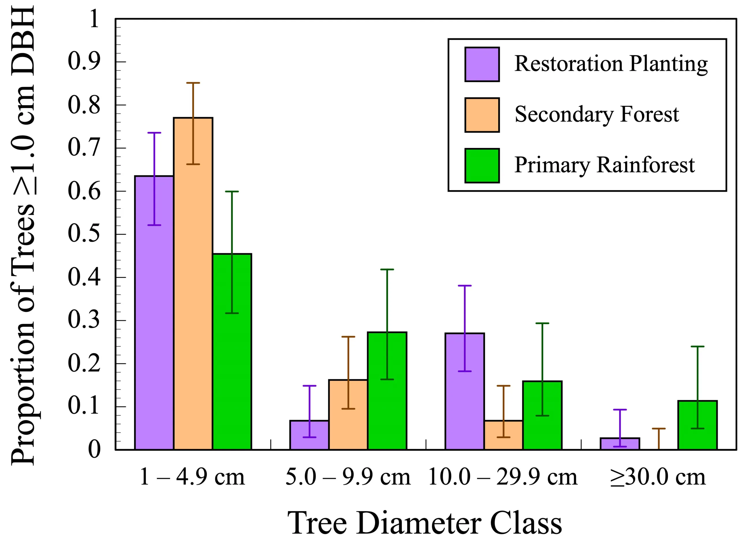Figure 3. Students measured the diameter at breast height (DBH) of all trees ≥1.0 cm DBH in one 10 m 10 m plot within each vegetation type surveyed. The proportion of small trees was greater in the restoration and secondary forest sites than in the primary rainforest, while the proportion of trees in larger size classes was greatest in the primary rainforest. Overall proportions (and 95% confidence intervals) of trees within four diameter size classes are shown for the three sites surveyed.