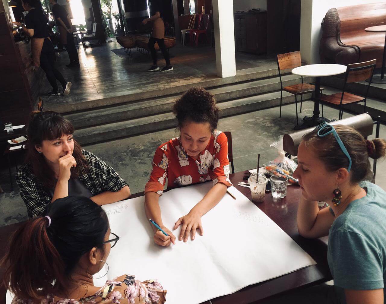 4:15 PM: On our data analysis day back in town, Jozlyn works with Tally (intern), Sopheak (field assistant/translator), and Karen (SAM) to practice interview skills and learn how to create kinship diagrams as a part of the Phnom Kulen origin and migration histories component of the research project.