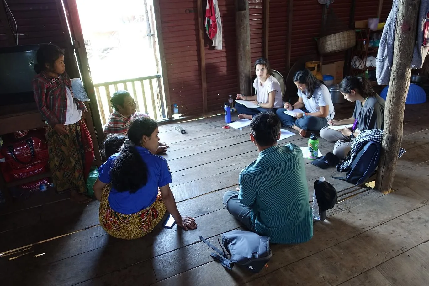 2:00 PM: Robyn, Tori, and Bella are interviewing community members about their livelihoods, perceptions of climate change, and climate change vulnerability and resilience. The community members they interview show them various fishing tools…and the neighborhood kids peek in to see what is happening!