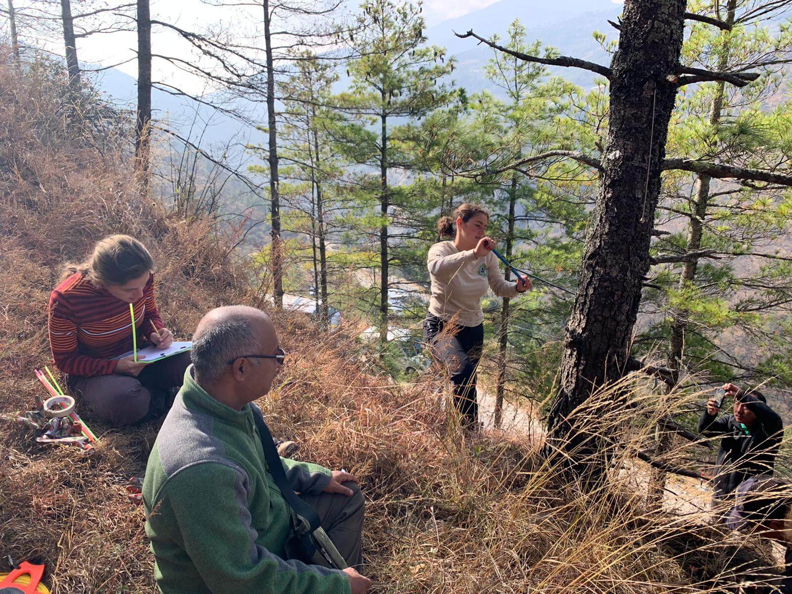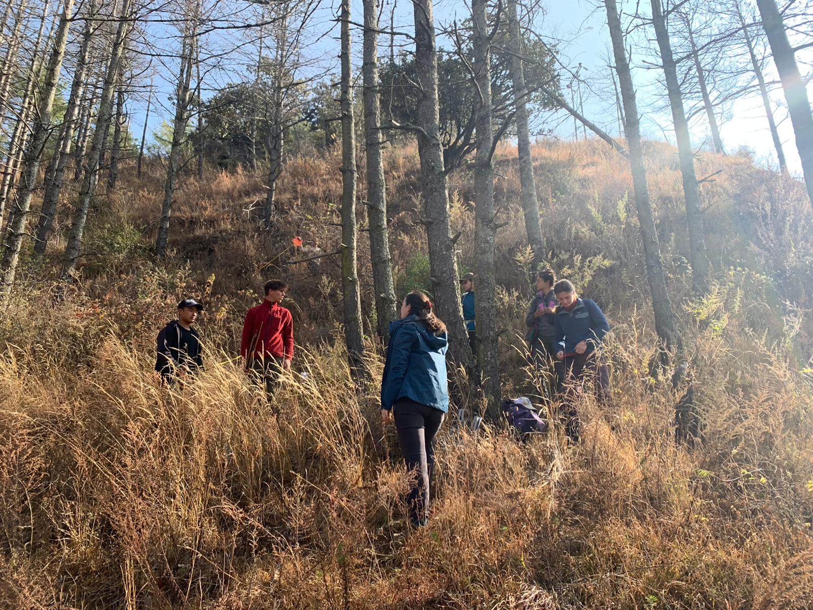 Meanwhile, Dr. Purna Chhetri (Lecturer for Mountain Ecology) is spearheading research on blue pine dieback. On hillslopes across this region of Bhutan, patches of forest have seen the needles of blue pine trees turn orange and brittle. Six students have spent their DR in forest plots exploring various factors contributing to this spreading ecological phenomenon; their hypothesis is that drought has weakened these trees, allowing different pathogens to infiltrate and ultimately kill them. By measuring, sampling, and coring blue pine trees in various stages of health, observing environmental factors such as soil composition and the presence of mistletoe, and examining patterns in climatic conditions, they hope to better understand the reasons behind the decline of blue pine stands.