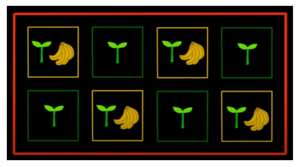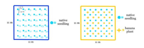 After speaking to a local syntropic farmer, SFS students learned that banana plants are a perfect companion to support seedling growth. They grow fast to provide shade for shade-loving species and hold water in their leaves and trunks—which can be later pruned to create ground cover and natural fertilizer. To test the effect of incorporating syntropic principles into restoration, eight subplots (measuring 11x11m) were created within the first planting plot, with banana plants between the native seedlings in four of the eight subplots and four control subplots without interspersed banana plants. The subplots were arranged in random order to reduce bias from placement on the cinder cone (see Figures 1 & 2).