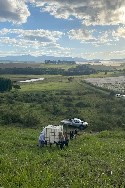 Dry seasons in the Wet Tropics can be just as severe and dramatically reduce the survival rate of the seedlings. With the upcoming dry season approaching (which is usually from September to December), the next priority became the transportation of water to the planted area at the cinder cone. QPWS provided two 300-liter water tanks and a pump to the Center, while a volunteer from TREAT donated a 1,000-liter trough to the project. The next cohort of SFS students transported the trough to the fenced-off area to be filled with water as a temporary watering source.