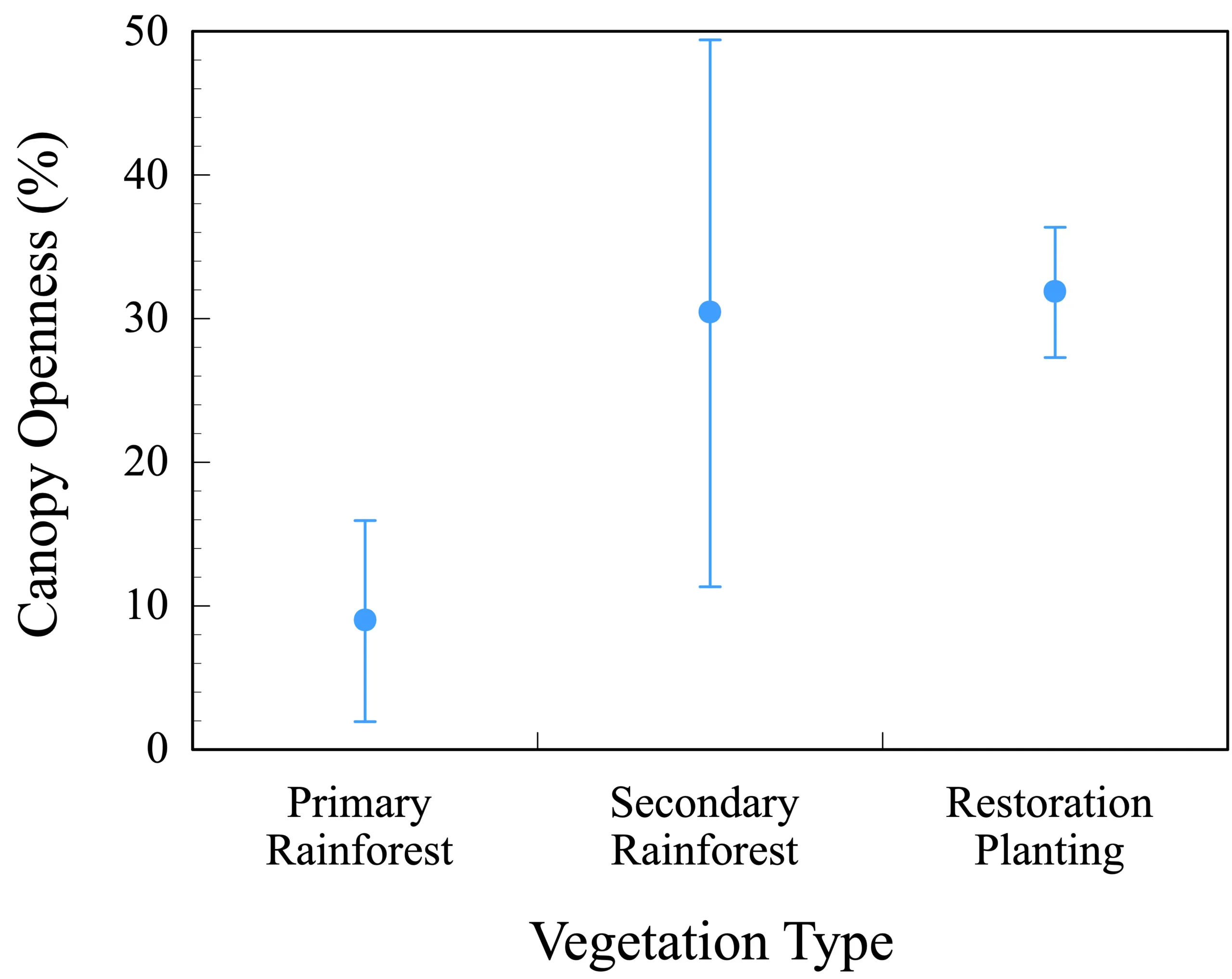 Figure 2. Students measured canopy openness (which is directly related to the amount of sunlight that reaches the forest floor) with a convex spherical densiometer. Mean values (and 95% confidence intervals) for canopy openness are shown for each of the sites surveyed. Canopy openness (and thus light availability) is substantially greater in the secondary rainforest and restoration planting sites than in the primary rainforest. Indeed, students observed numerous pioneer (light-demanding) tree seedlings growing in the understories of the secondary rainforest and restoration sites.