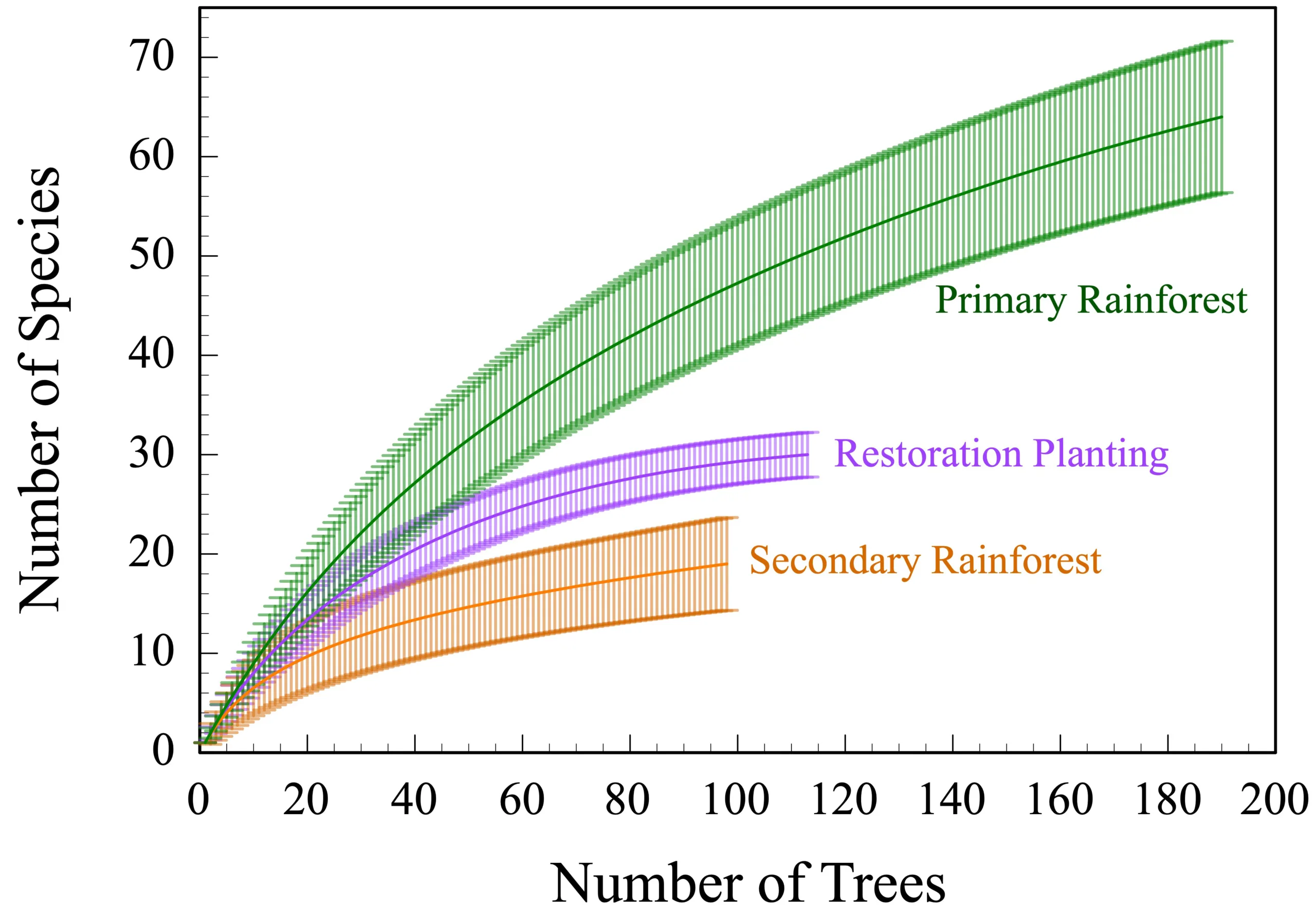 Figure 4. These species rarefaction curves show the mean number of species (and 95% confidence intervals) found for any given sample size (i.e., number of trees observed) within a single 11 m 17 m plot within each vegetation type examined. At any particular sample size, primary rainforest has the greatest species richness and secondary rainforest the least species richness.