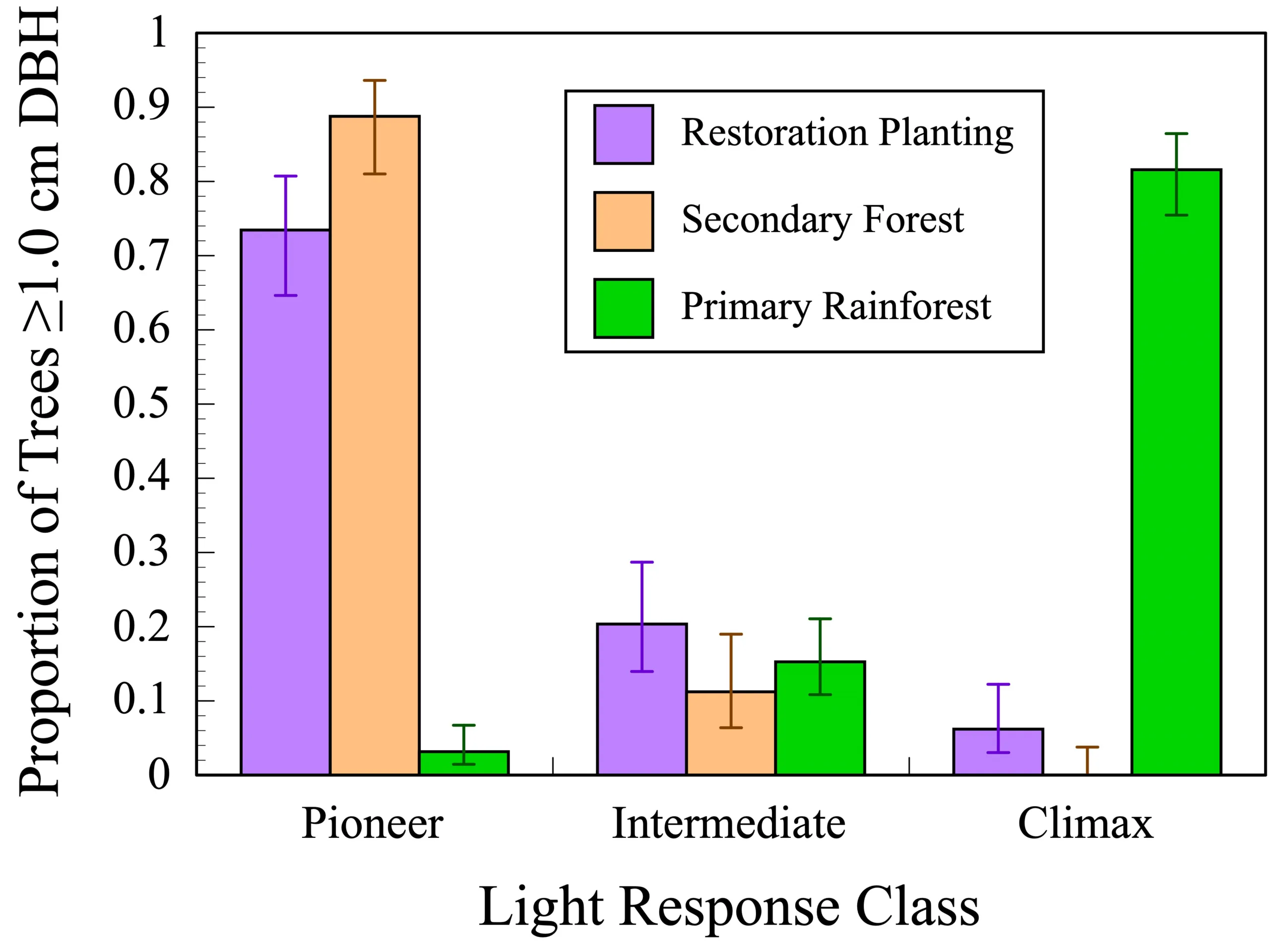 Figure 5. Species were divided into three categories, based on their responses to light availability. Species which require very high light availability and which are capable of very fast growth rates are known as pioneer species. Species which are able to survive in deep shade and which are only able to grow slowly are known as climax species. Species which lie between these two extremes were considered “intermediate species”. The proportion of trees ≥1.0 cm DBH in each vegetation type (and 95% confidence intervals) are shown. Primary rainforest is dominated by climax species, while secondary forest is dominated by pioneer species. Although more than half of the seedlings initially planted in the restoration site were from either intermediate or climax species, the restoration site is almost as dominated by pioneer species as the secondary rainforest site is. This may be due to the abundant recruitment of pioneer species that was observed at the restoration planting site.