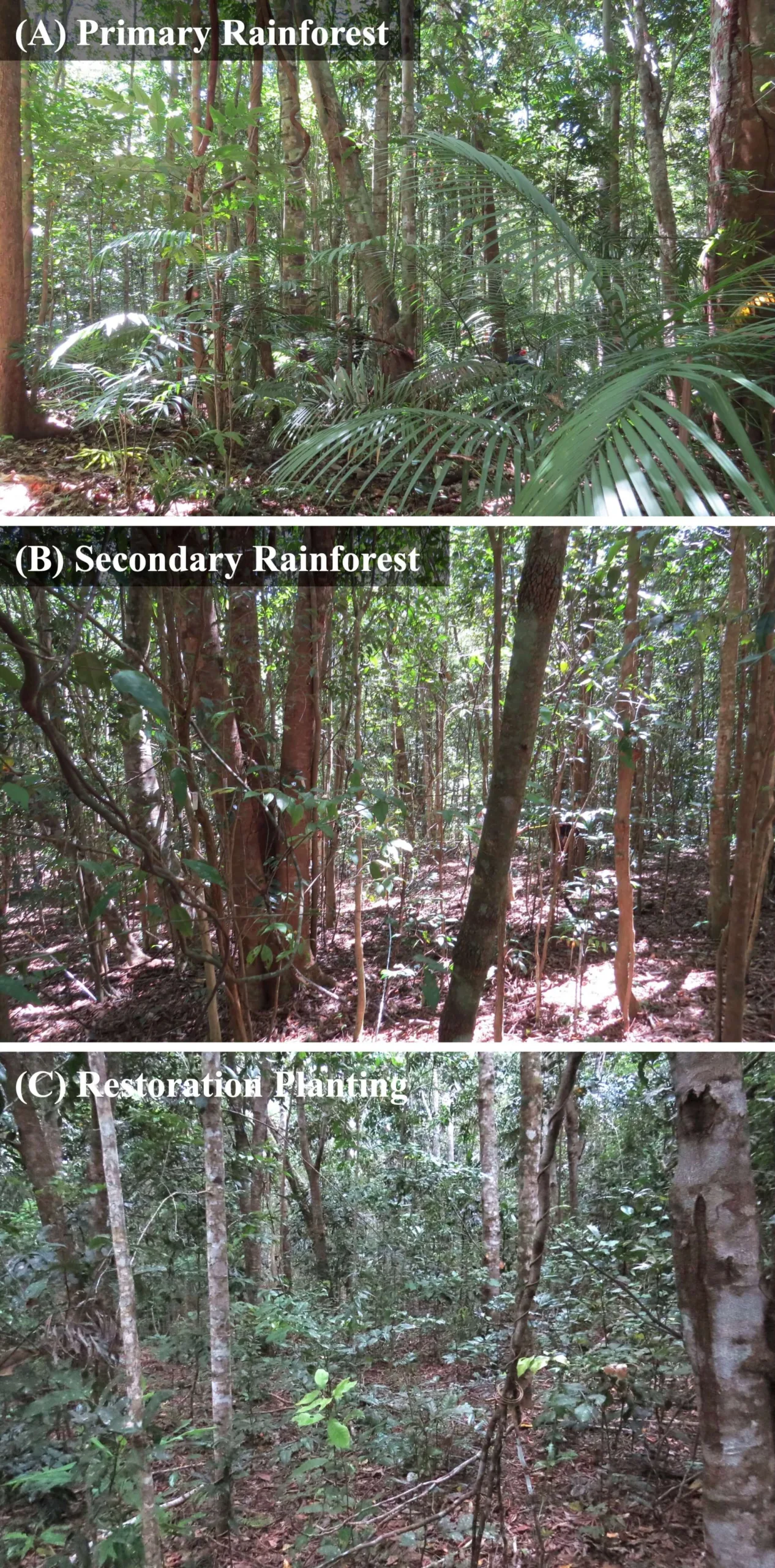 Figure 1. Students surveyed three vegetation types: (A) primary rainforest (rainforest that has not previously been clear-felled but which may have been selectively logged >50 years ago); (B) secondary rainforest (rainforest that was clear-felled in the 1950s, used for cattle pasture, then abandoned c. 1980) and; (C) a rainforest restoration planting (a diverse mixture of rainforest tree species were planted c. 1994) on the CRS property in the Atherton Tablelands.