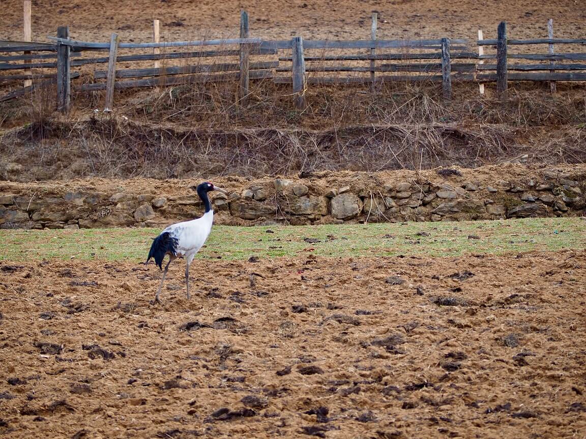 Fortunately, the government of Bhutan has realized the importance of this landscape and has protected over half of its total land area. This protection is in the form of National Parks, Wildlife Sanctuaries, and, possibly the most important, biological corridors. These corridors allow animals to migrate throughout the country and are a reason that scientists were able to discover the wild altitude gradients that tigers migrate through in this region. Along with biological corridors, camera trapping allowed scientists to capture images of a tiger at an altitude of over 11,000 feet, which was tracked from the Royal Manas National Park in southern Bhutan. Also, Bhutan is known as the only place in the world where tigers and snow leopards are known to coexist. Because of Bhutan’s commitment to environmental protection stemming from Buddhist beliefs and traditions, many species have begun to rely on this land and its resources including the tiger, which has recently had a surge in population, and the black-necked crane, which annually roosts in the protected wetland area of Phobjikha valley.
