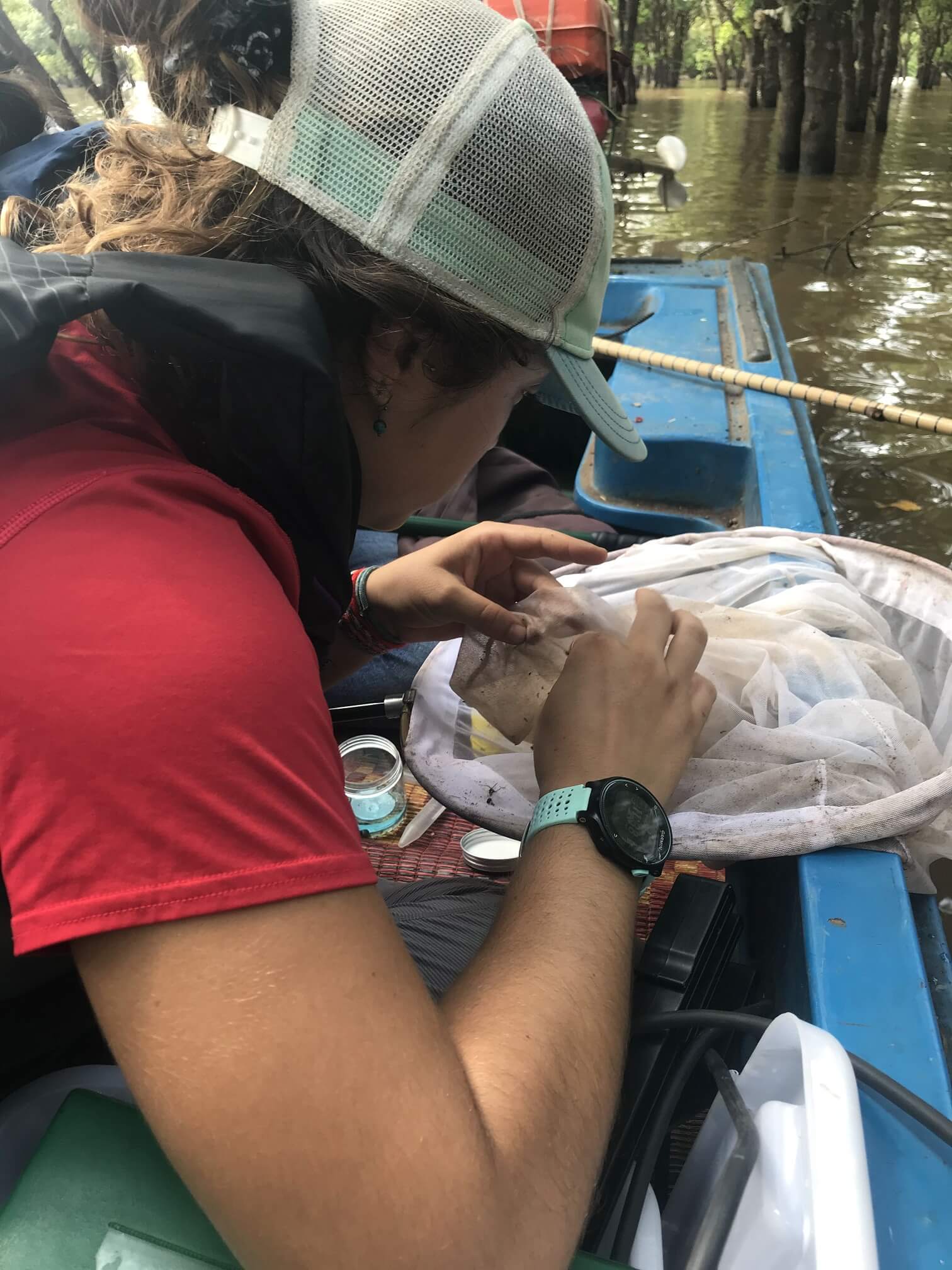 9:30 AM: Fish aren’t the only things in the lake! SFS student Mattea and RUPP student Soksan collect water quality information and then skim the water’s surface for macroinvertebrates. These macroinvertebrates are aquatic bioindicator species, and will be examined and analyzed later to evaluate the ecological health of the Tonle Sap.