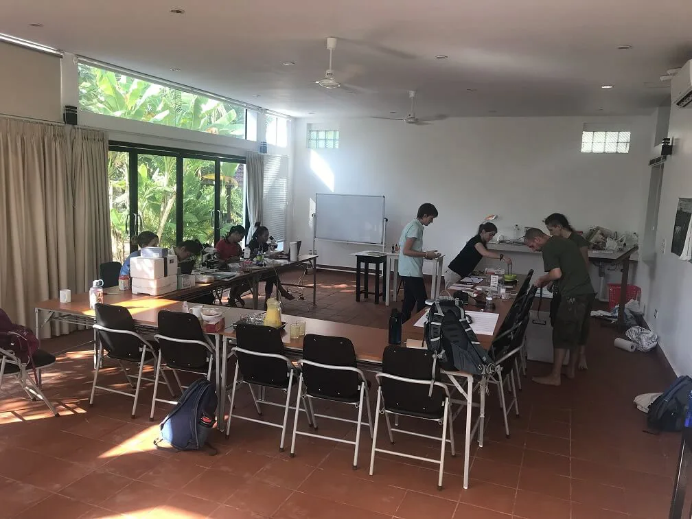 3:45 PM: The lake group has returned to the center in Siem Reap town, where our classroom has turned into a lab! Students are using microscopes to identify macroinvertebrates collected earlier in the day, and working with partners from Angkor Center for Conservation of Biodiversity (ACCB) to study water snakes and preserve them for further taxonomy studies and conservation initiatives.